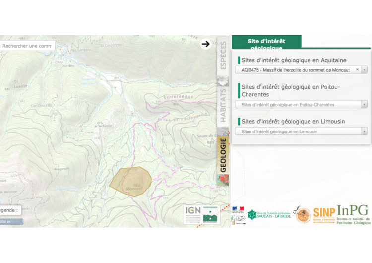 🤨 Enfin des nouvelles qui vont dans le sens du classement géologique du massif de lherzolite du sommet de Moncaut.En effet, alors que jusqu’à maintenant, aucune information sur les sites recensés n’apparaissait sur l’Aquitaine (manque de motivation, voire plus ?), l’OFSA (Observatoire Flore Sud-Aquitaine) fait paraître sur son site une liste de 58 sites classés sur les Pyrénées Atlantiques comprenant le sommet de Moncaut. (voir le site « obv-na.fr/consulter/carte#« , cliquer onglet « Géologie » en milieu d’écran, puis « Sites d’intérêt géologique en Aquitaine » et taper Moncaut pour voir apparaître « AQI0475 – Massif de lherzolite du sommet de Moncaut »).
